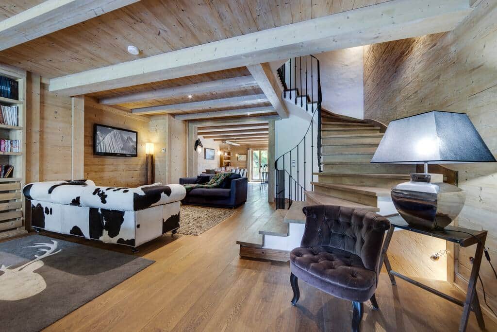 The chalet enjoys a sunny aspect with open views towards the surrounding mountains and glaciers, which can be enjoyed from its terraces and balconies. Inside, the generous living spaces provide a comfortable and sociable setting, with a wood-burning fireplace forming the centre of the main living area.